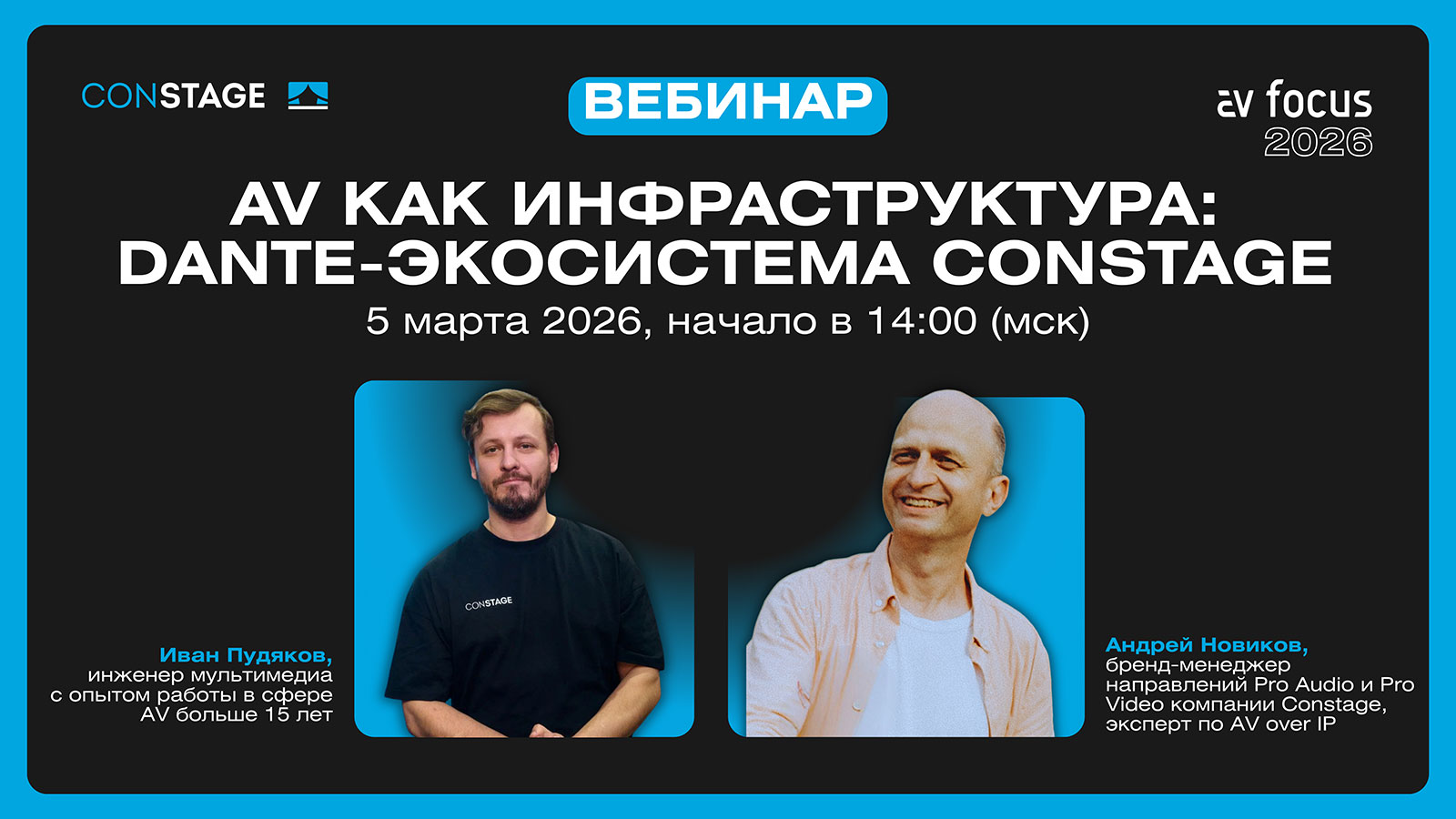 5 марта в 14:00 по московскому времени на портале AV Club пройдёт онлайн-вебинар Constage. За 60 минут мы представим полный разбор нашей Dante-экосистемы: от аппаратного контроллера до конечных устройств, живое демо из шоурума и ответы на вопросы.